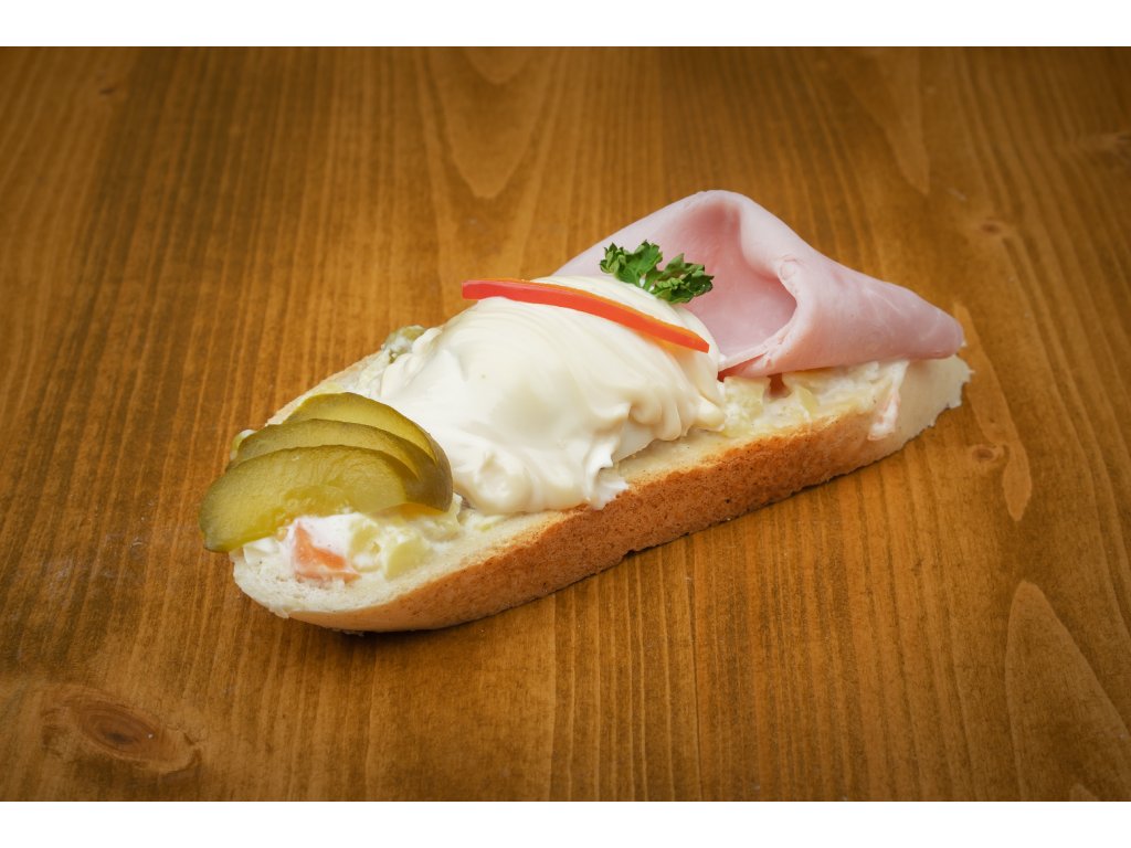 Chlebíček s bramborovým salátem, šunkou, vajíčkem, okurkou, paprikou a majonézou.