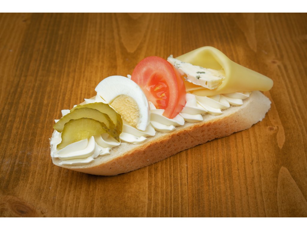 Chlebíček s pomazánkovým máslem, sýrem Gouda, nivou, okurkou, vajíčkem, rajčaty.