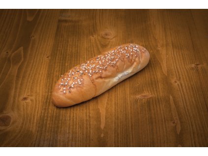 Pizza rohlík plněný anglickou slaninou, tomatovou omáčkou, sypaný strouhaným sýrem