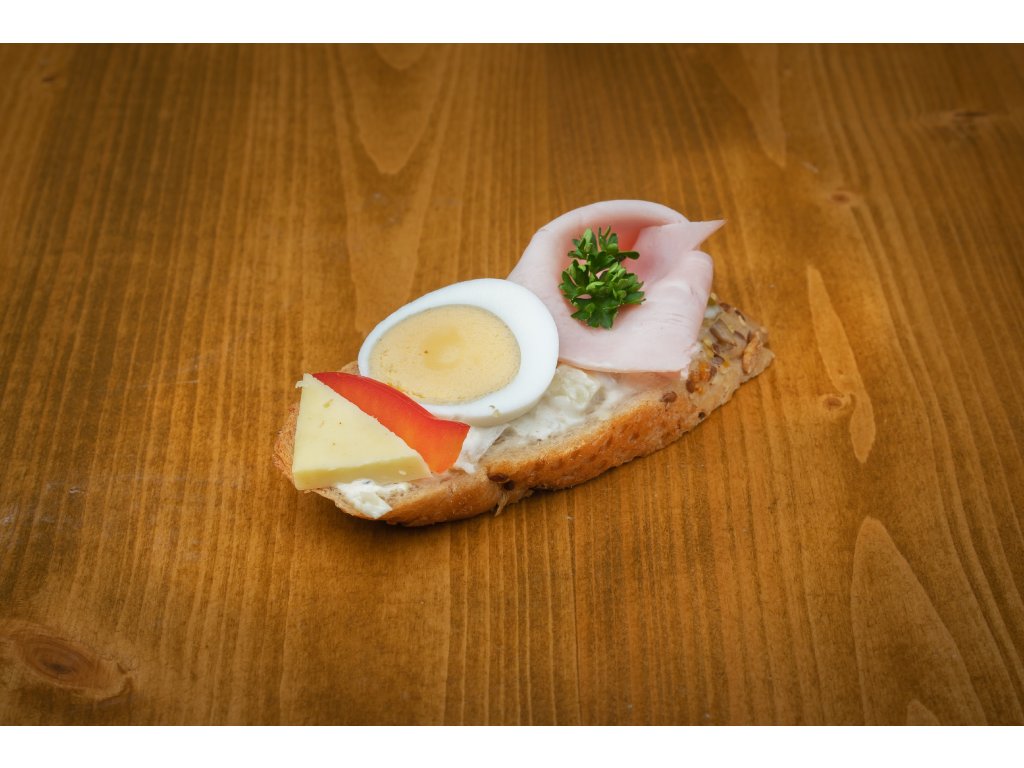 Rautový chlebíček s bramborovým salátem, šunkou, vajíčkem, paprikou a sýrem Gouda.