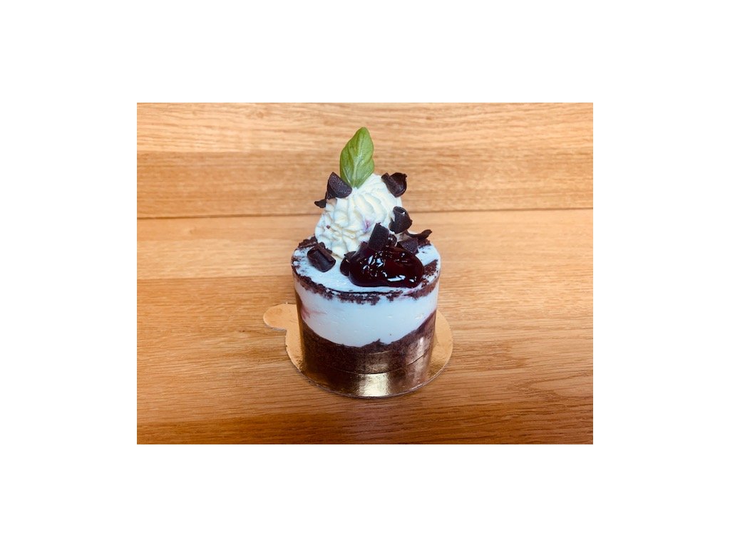 Dortík s čokoládovým korpusem, živočišnou šlehačkou, višňovým vkladem s čokoládovými hoblinkami.