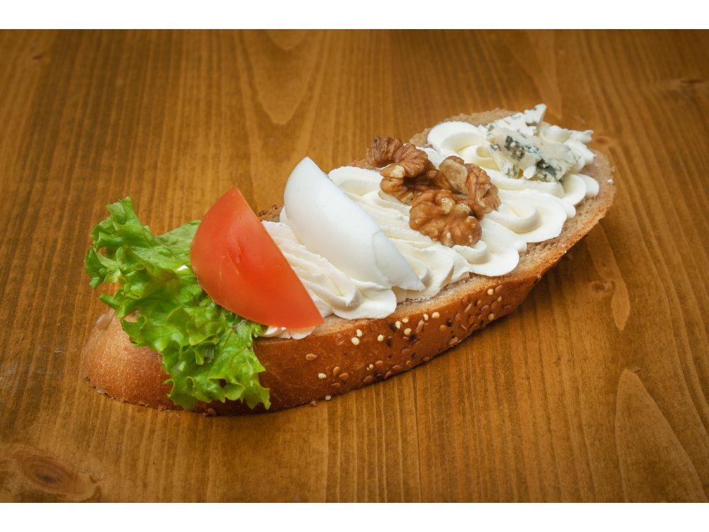 Vícezrnný chlebíček s pomazánkovým máslem, nivou, ořechy, rajčaty, vajíčkem a lollo salátem.y